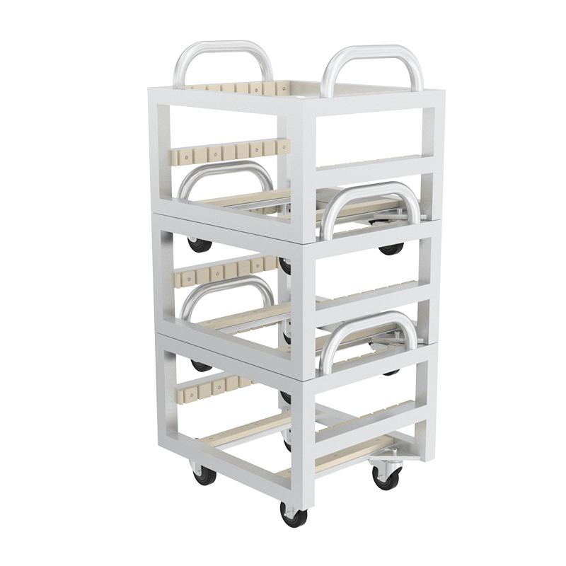 The cart is an all-welded aluminium construction designed for maximum strength and durability. Castor wheels with an added braking system come as standard, and all carts are fitted with polyamid base plate holders to avoid any scratching of the actual base plates. Ease of handling is guaranteed, and the carts are stackable when empty, allowing you to save essential storage space when not in use.