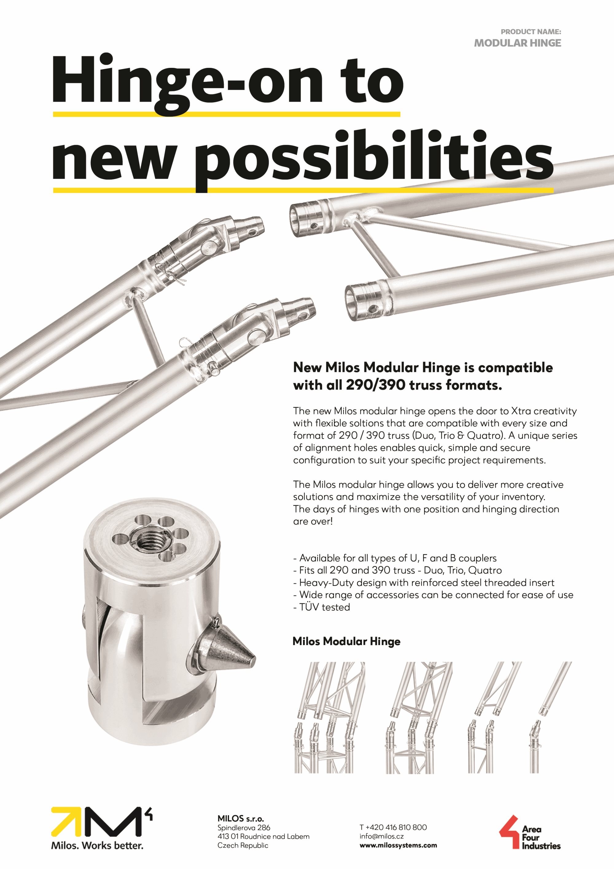 MODULARHINGE-B New MILOS Modular Hinge is compatible with all 290/390 truss formats and connector types.