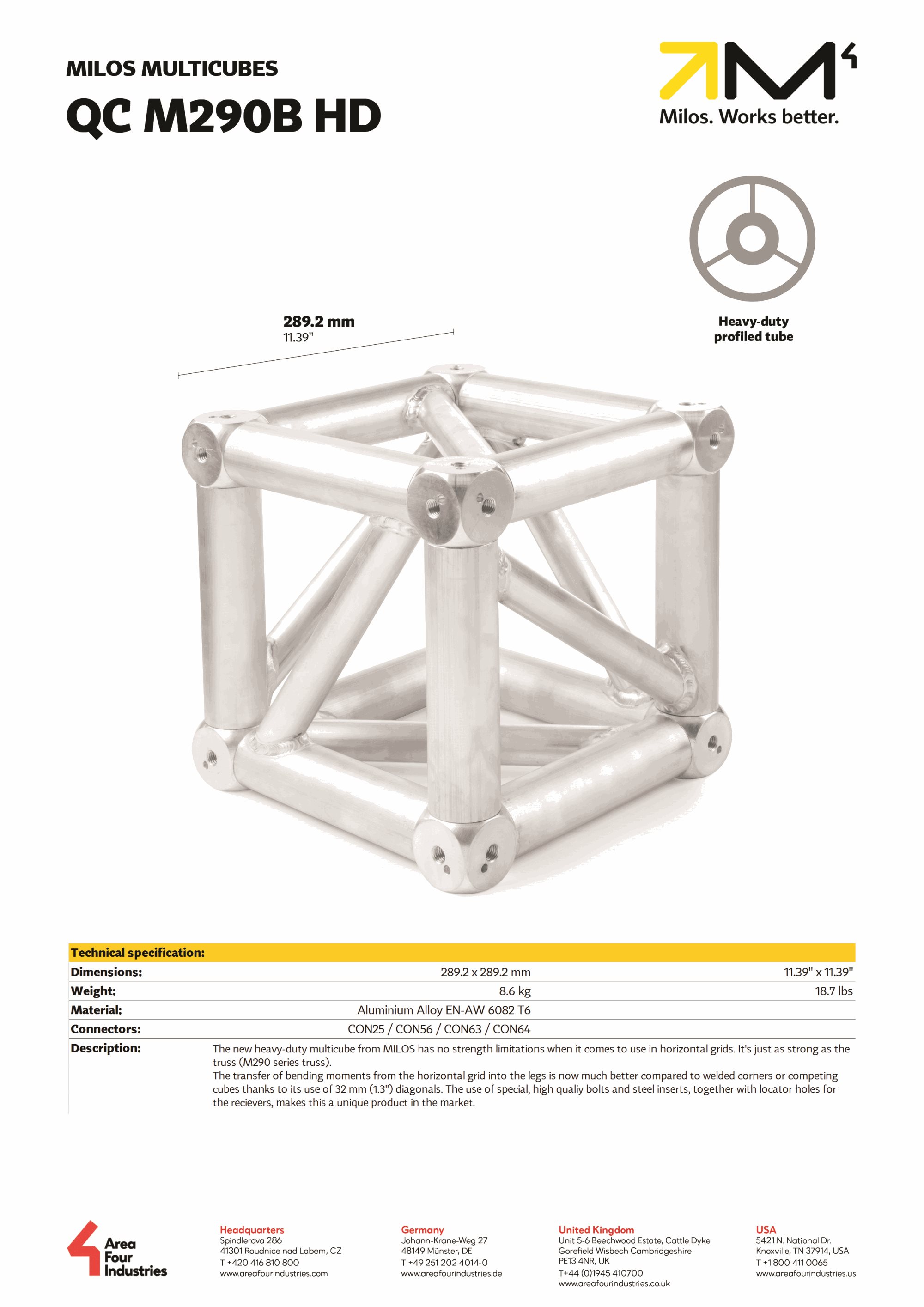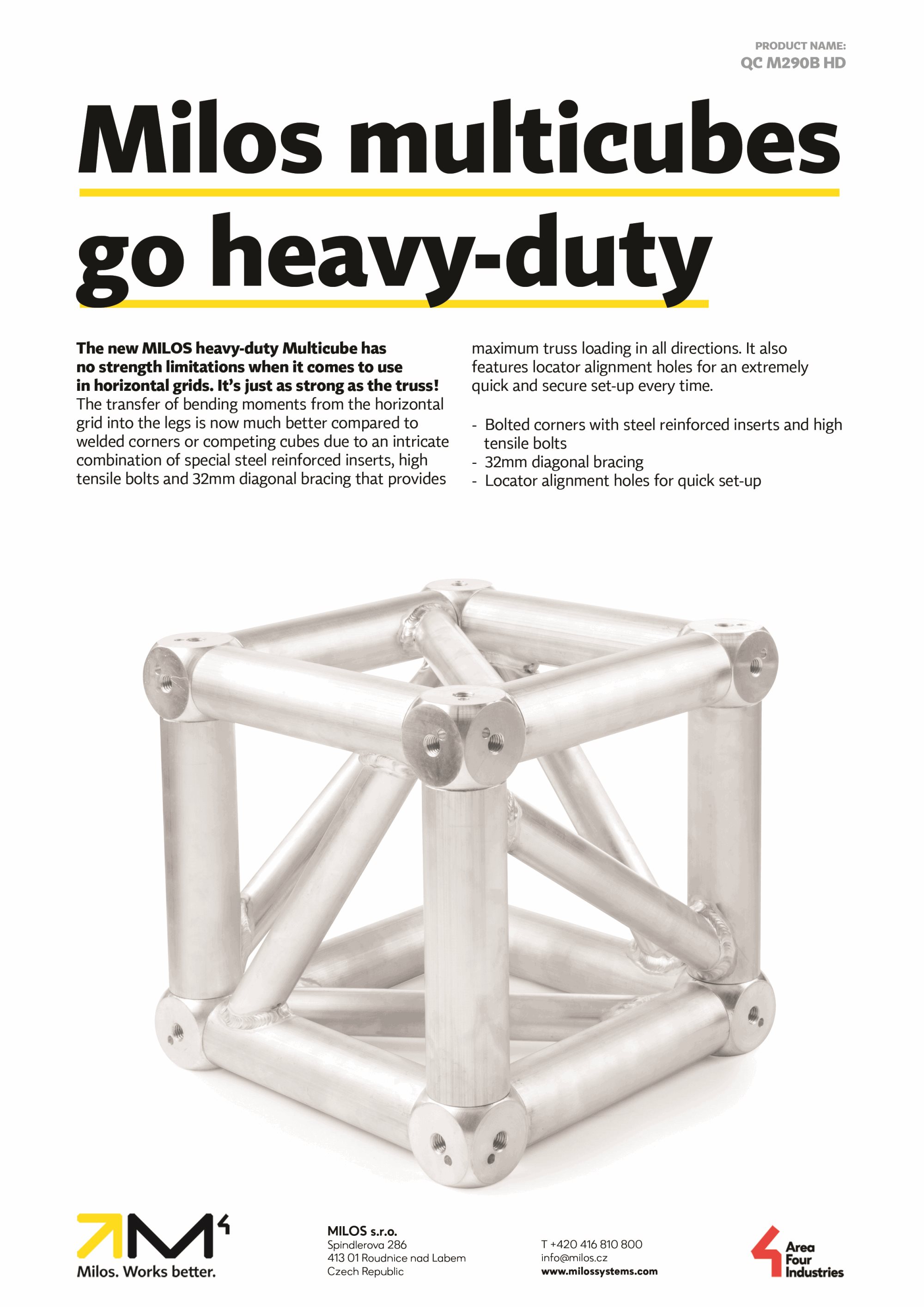 The new heavy-duty multicube from MILOS has no strength limitations when it comes to use in horizontal grids. It's just as strong as the truss (M290 series truss).