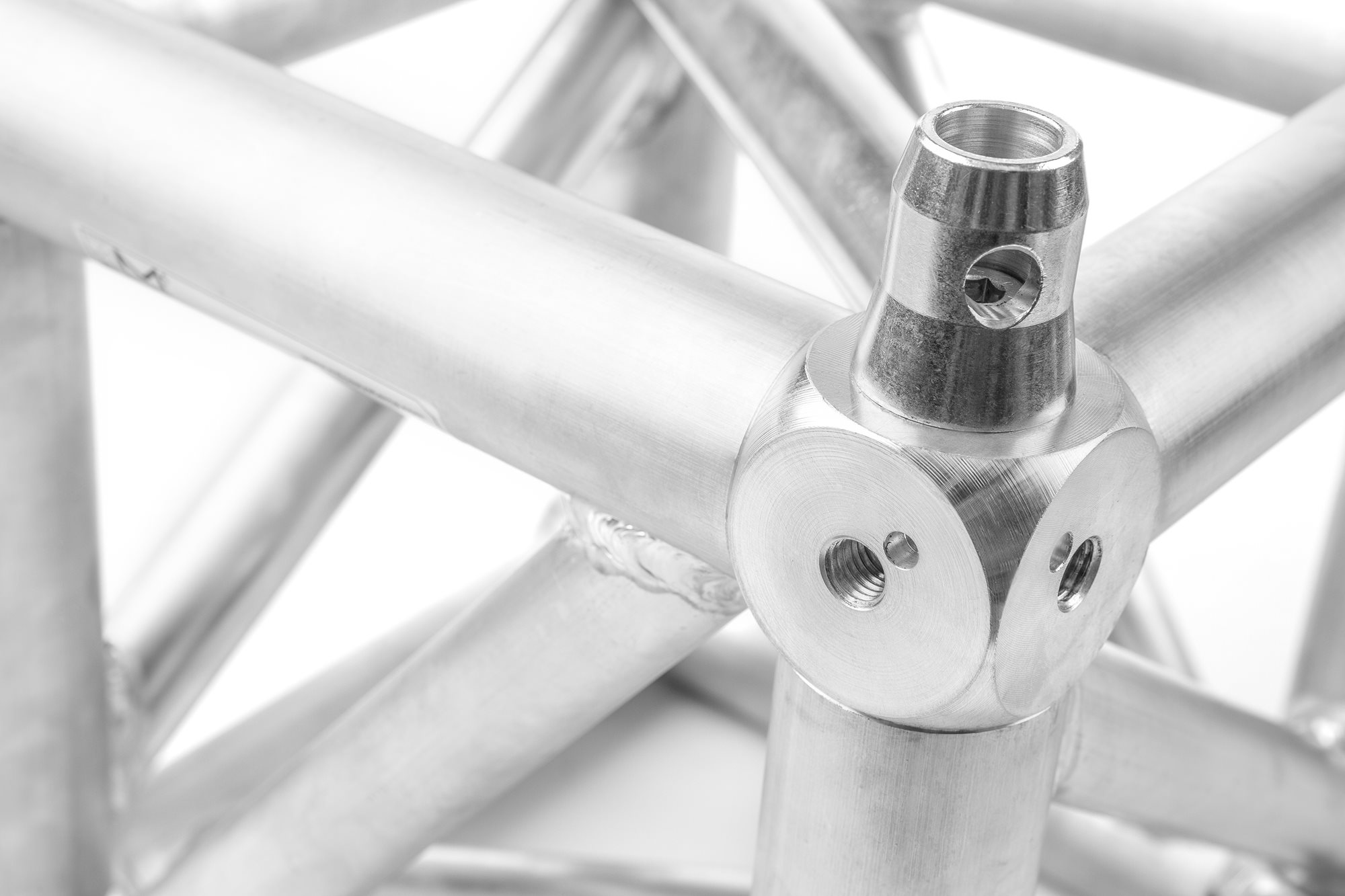 The transfer of bending moments from the horizontal grid into the legs is now much better compared to welded corners or competing cubes thanks to its use in 1.3'' diagonals. The use of special, high quality bolts and steel inserts, together with locator holes for the recievers, makes this a unique product in the market.
