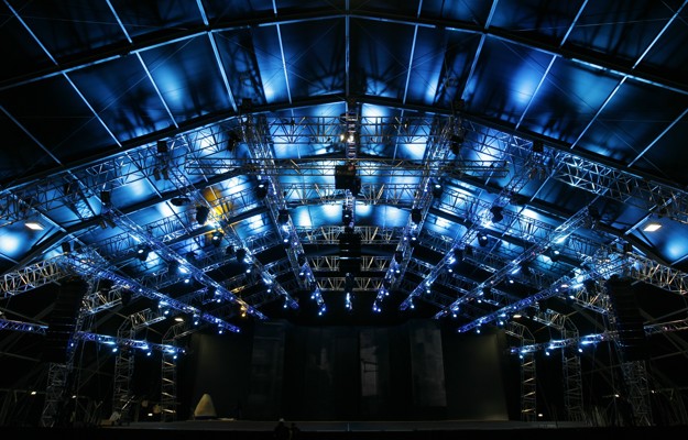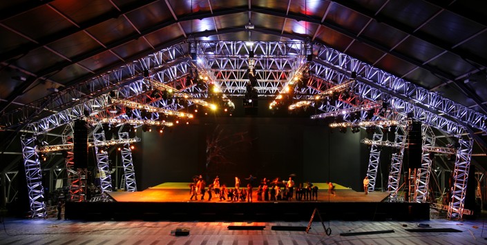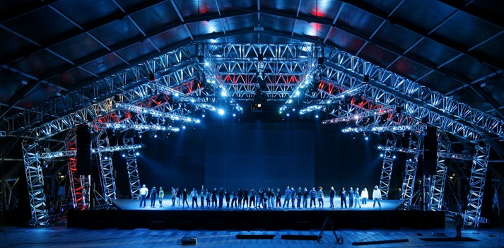 Client requested theatrical structure with dramatic look and expensive free span. Cost effective solution utilized M950 RTT with unique corner adapters to help complete this project in an extremely short lead time.