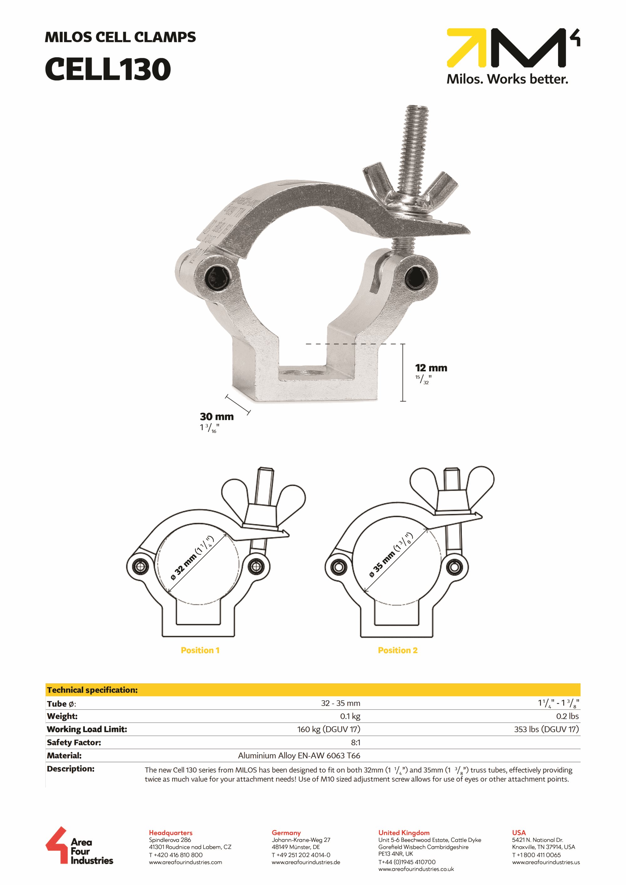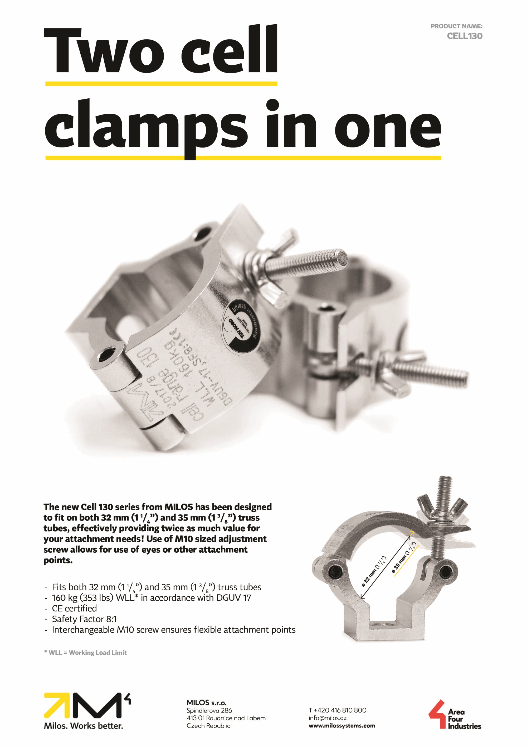 The new Cell 130 series from MILOS has been designed to fit on both 32 mm (1 1/4”) and 35 mm (1 3/8”) truss tubes, effectively providing twice as much value for your attachment needs!