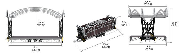 The robust structure allows pre-rigging of the roof up to 800 kg (1763 lbs) with a total loading capacity of 1.1 metric tonnes (2425 lbs). Keeping the weight of the system below 3.5 metric tonnes (7716 lbs) and the transportation height of only 3.2 metres (10.5 ft) simplify transport to the dedicated event location. After unfolding, you have a covered event stage measuring 8 x 6 metres (26.2 x 19.7 ft) for any performance!
