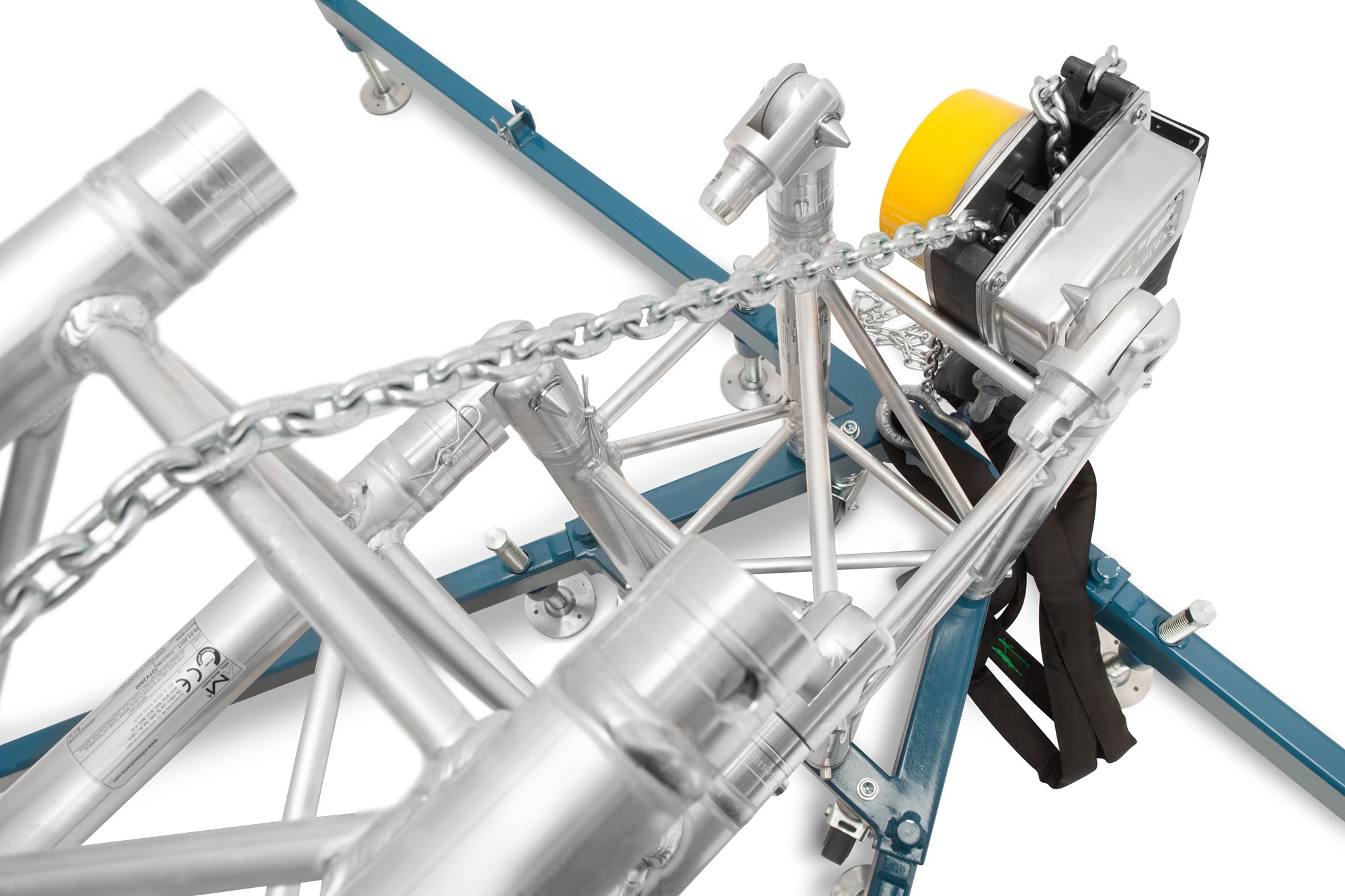 Set up is easy. Only a few 290 QTV truss components are needed to erect the tower and only 2 persons are required to accomplish this feat. Due to a height of just under 5 meters, approvals by authorities are not necessary. The design allows for placement of base cabinets or amplifier racks on top of the outriggers.