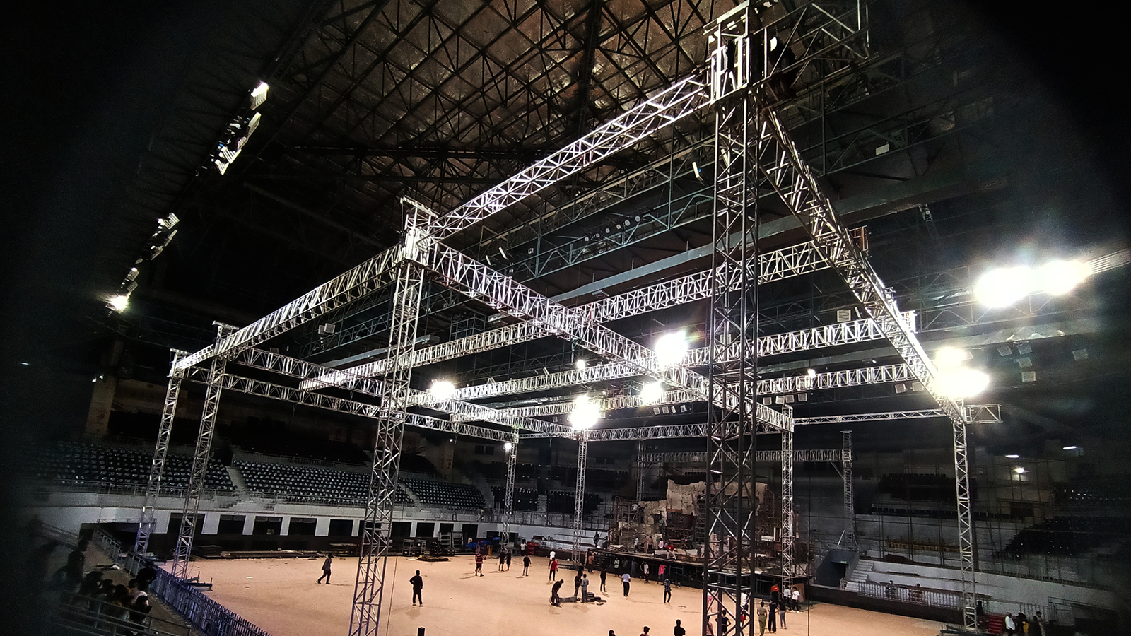 The build itself used a gigantic 39m x 30m x 13m MILOS ground support truss constructed from M950 truss and MT3 towers. From this ground supported truss approximately 8500 kgs of load was suspended which consisted of intelligent and static lighting fixtures such as 375 LED pars, 50 LED washes, and 48 Pointes, a bright, super-fast parallel beam that cuts through the air and across video with ease,